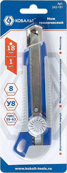 Нож технический КОБАЛЬТ лезвие 18 мм, двухкомпонентный корпус, металлическая направляющая, фиксатор, блистер (242-151) - цена, фото, технические характеристики