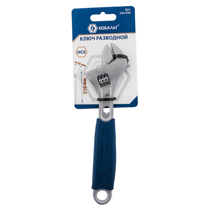 Ключ разводной с увеличенным хватом КОБАЛЬТ 210 мм, ширина захвата 30 мм, двухкомпонентная рукоятка, подвес (244-940) - цена, фото, технические характеристики