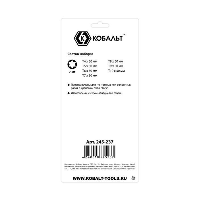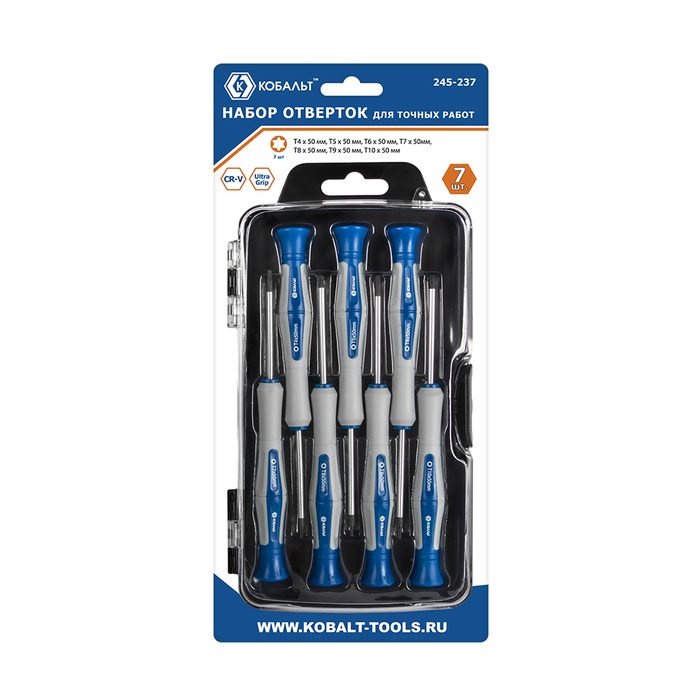 Набор отверток КОБАЛЬТ для точных работ Ultra Grip 50 мм, 7 ШТ: T4, T5, T6, T7, T8, T9, T10, CR-V, кейс, блистер (245-237) - цена, фото, технические характеристики