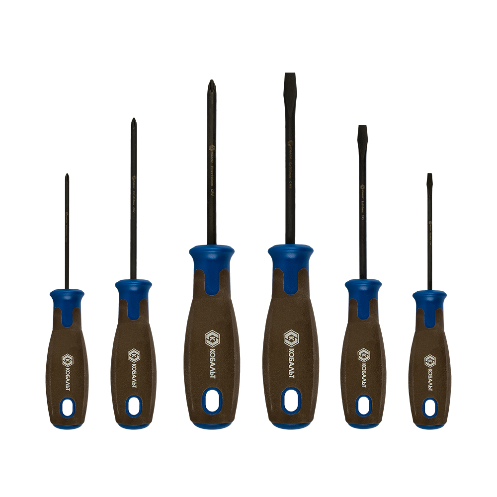 Набор отверток КОБАЛЬТ POLYWOOD, 6 ШТ: РН0, РН1, РН2, SL3, SL5, SL6, CR-V, древ.-полимер. рукоятки, пласт. держатель, подвес (912-182)