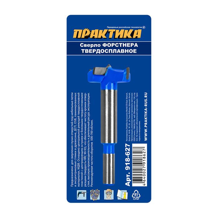 Сверло петельное Форстнера ПРАКТИКА 30 мм, твердосплавное, (1шт), блистер (918-627) - цена, фото, технические характеристики