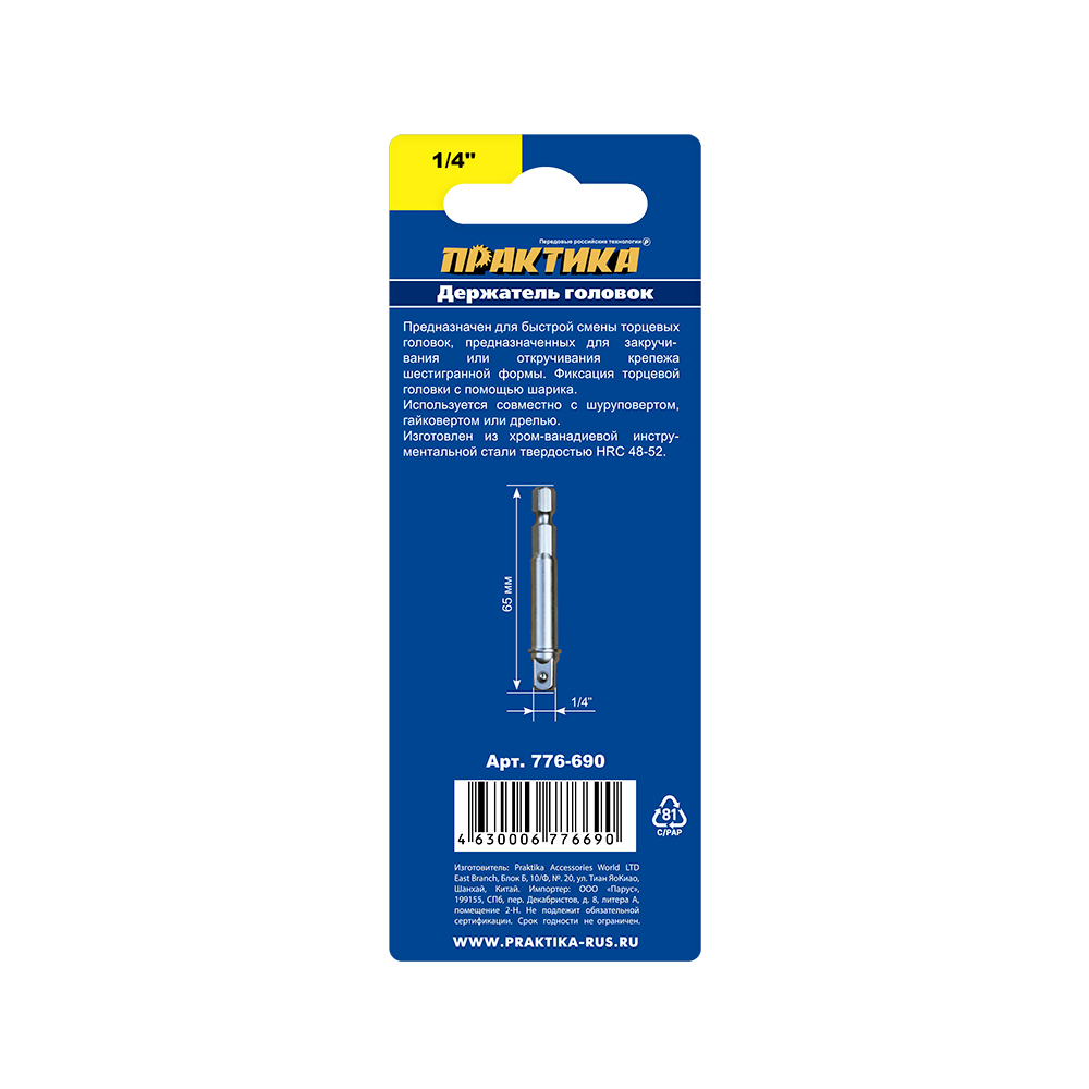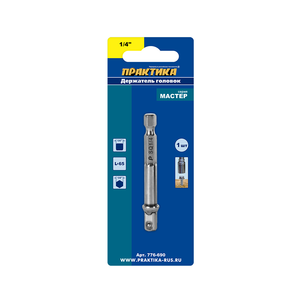 Адаптер ПРАКТИКА квадрат 1/4" для головок, длина 65 мм, хвостовик шестигранник 1/4" (776-690) - цена, фото, технические характеристики