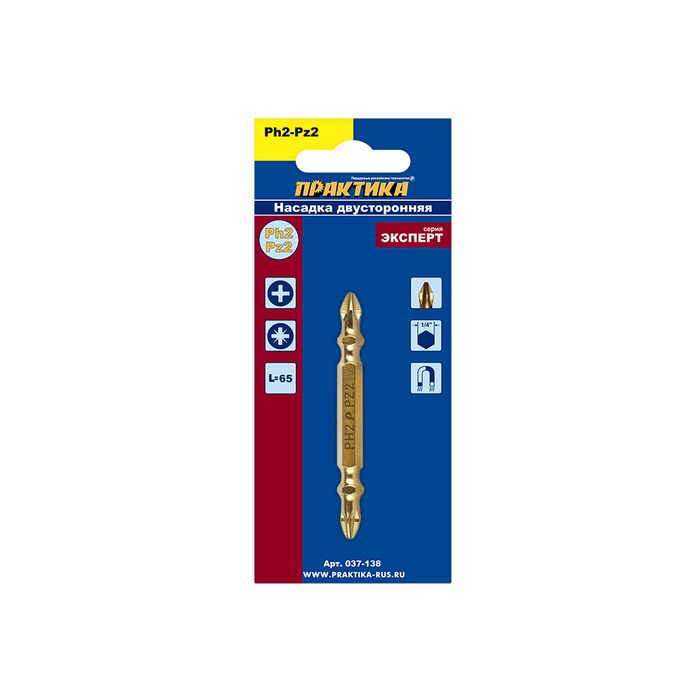 Бита отверточная ПРАКТИКА "Эксперт" двусторонняя PH-2 / PZ-2 х 65мм Tin (1шт), блистер (037-138) - цена, фото, технические характеристики