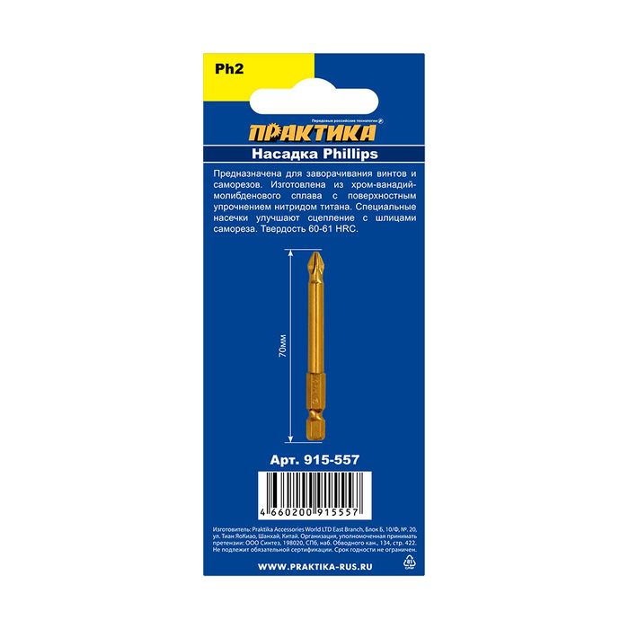 Бита отверточная ПРАКТИКА "Эксперт" PH-2 х 70 мм (1 шт) блистер (915-557) - цена, фото, технические характеристики