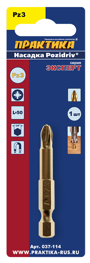 Бита отверточная ПРАКТИКА "Эксперт" PZ-3 х 50мм Tin (1 шт), блистер (037-114) - цена, фото, технические характеристики