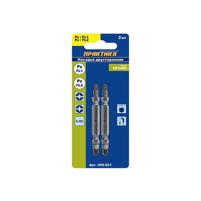Бита отверточная ПРАКТИКА "Профи" двусторонняя PZ/FL1-PZ/FL2 х 65мм (2шт), блистер