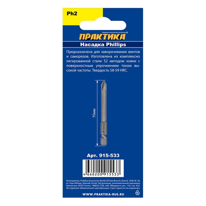 Бита отверточная ПРАКТИКА "Профи" PH-2 х 70 мм (2 шт) блистер (915-533) - цена, фото, технические характеристики