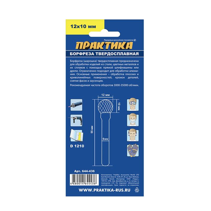 Борфреза твердосплавная ПРАКТИКА тип D шарообразная,12 мм, хвостовик 6 мм (644-436) - цена, фото, технические характеристики