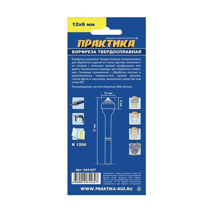 Борфреза твердосплавная ПРАКТИКА тип K зенкер 90 град, 12 х 6 мм, хвостовик 6 мм - цена, фото, технические характеристики