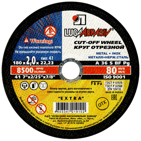 Диск абразивный отрезной по металлу Луга-Абразив Extra 180 x 2.0 x 22мм +нерж (150/25шт) - цена, фото, технические характеристики