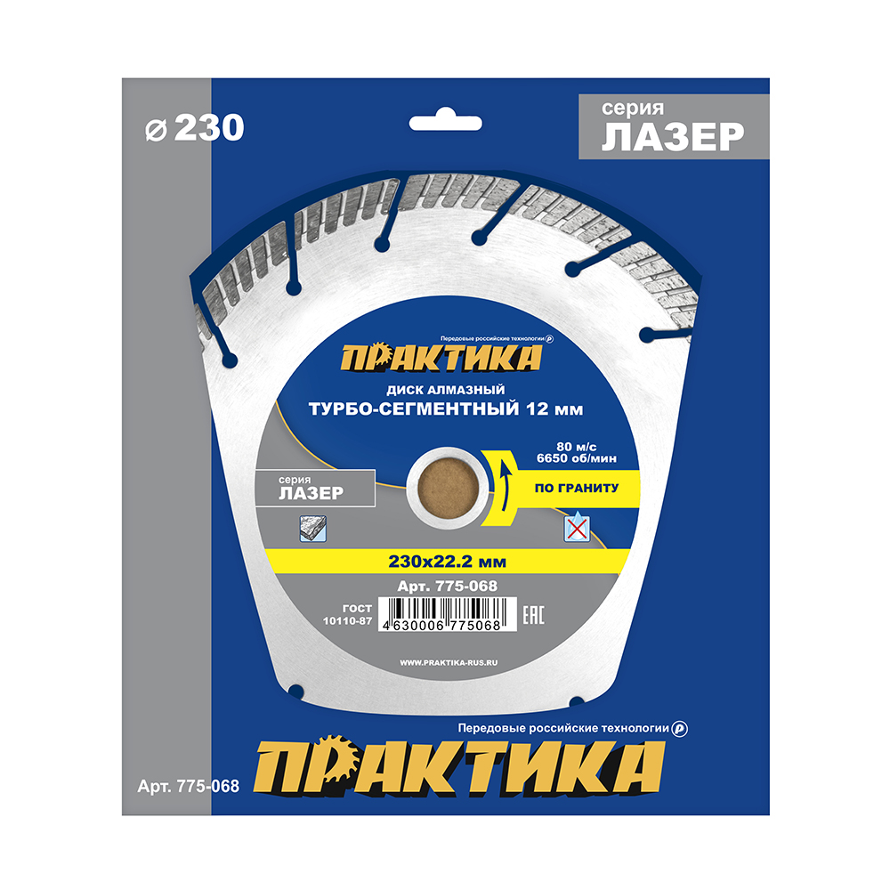 Диск алмазный турбосегментный ПРАКТИКА "Лазер-ГРАНИТ" 230 х 22 мм сегмент 12 мм (775-068) (775-068)