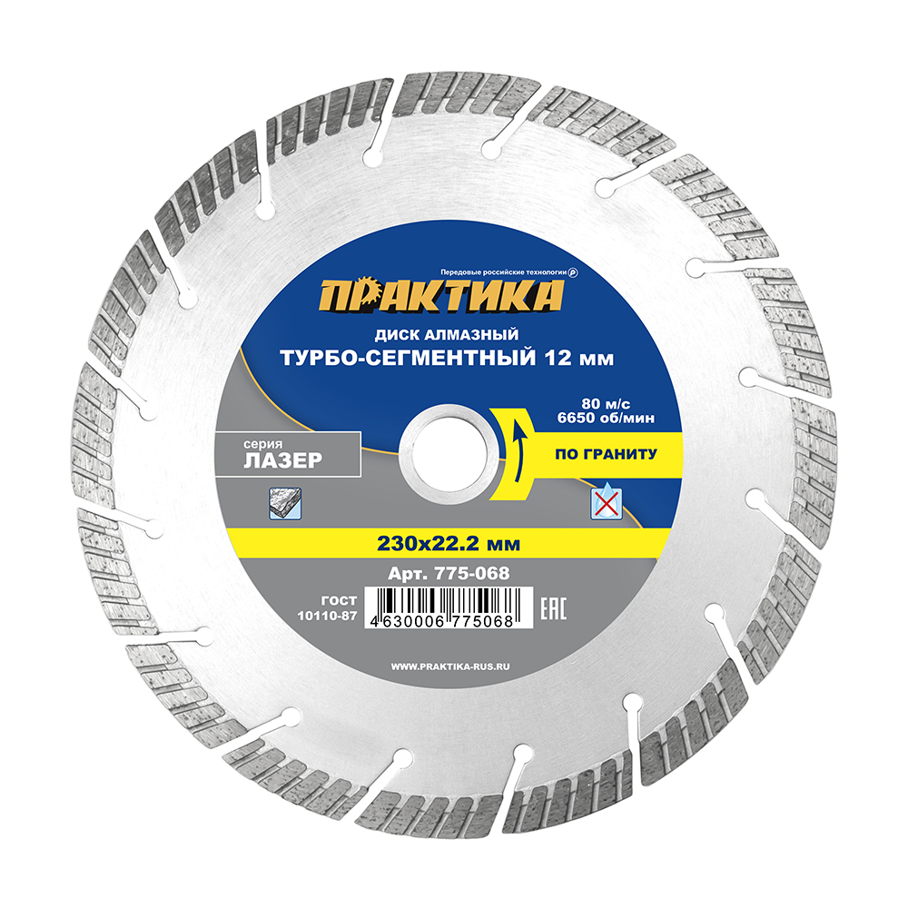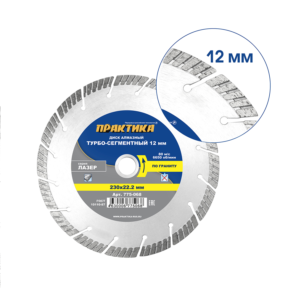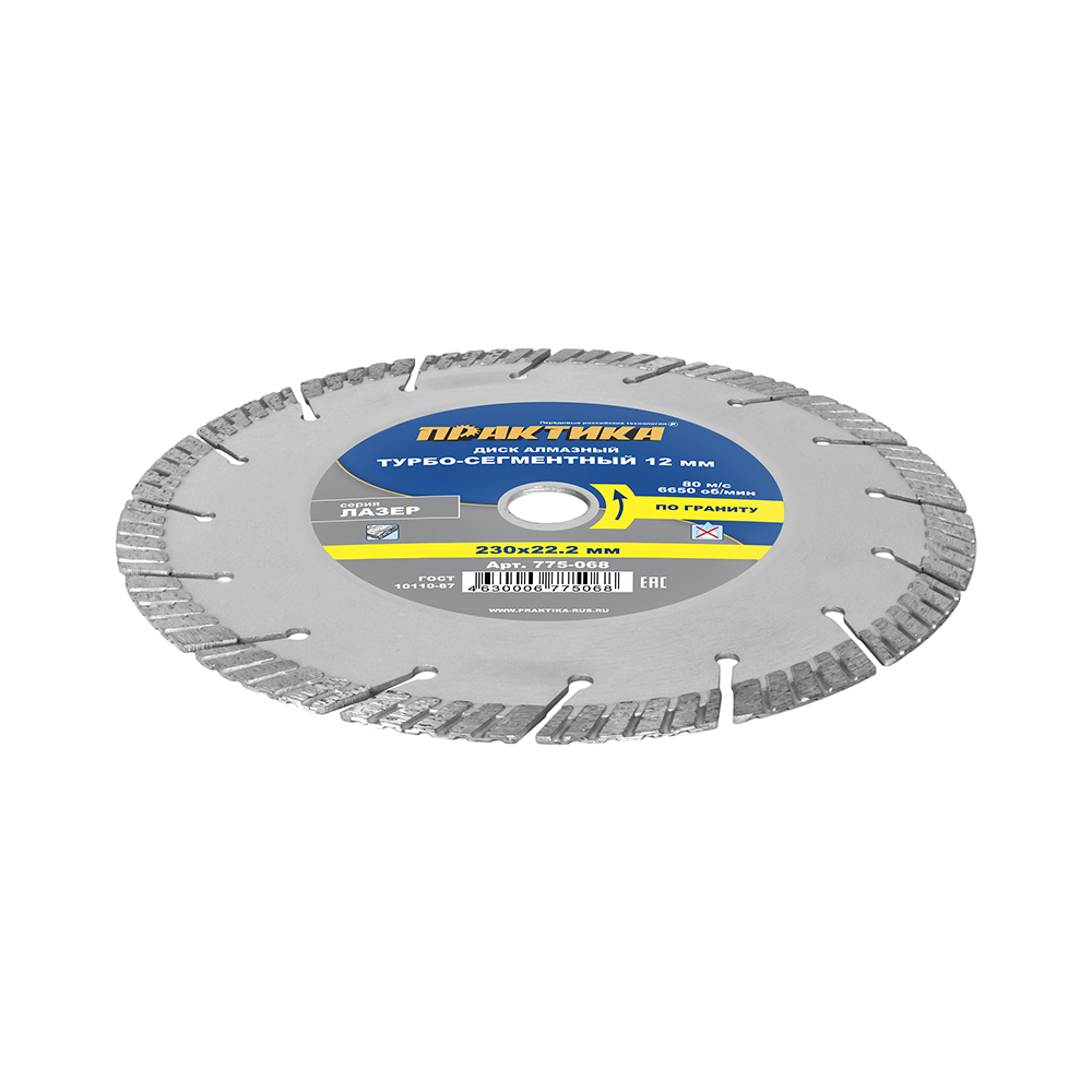 Диск алмазный турбосегментный ПРАКТИКА "Лазер-ГРАНИТ" 230 х 22 мм сегмент 12 мм (775-068) - цена, фото, технические характеристики