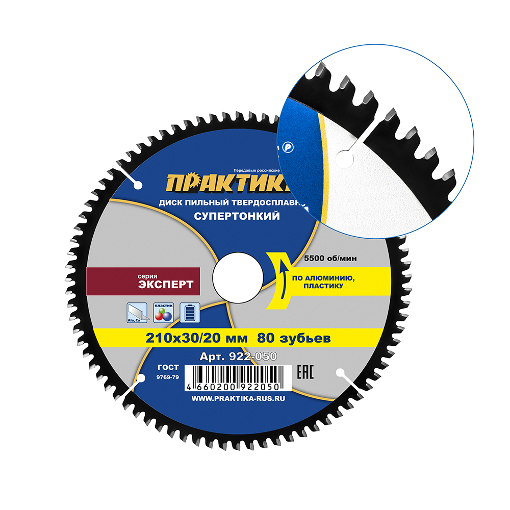 Диск пильный твердосплавный по алюминию ПРАКТИКА 210 х 30\20 мм, ТОНКИЙ, 80 зубьев (922-050) - цена, фото, технические характеристики
