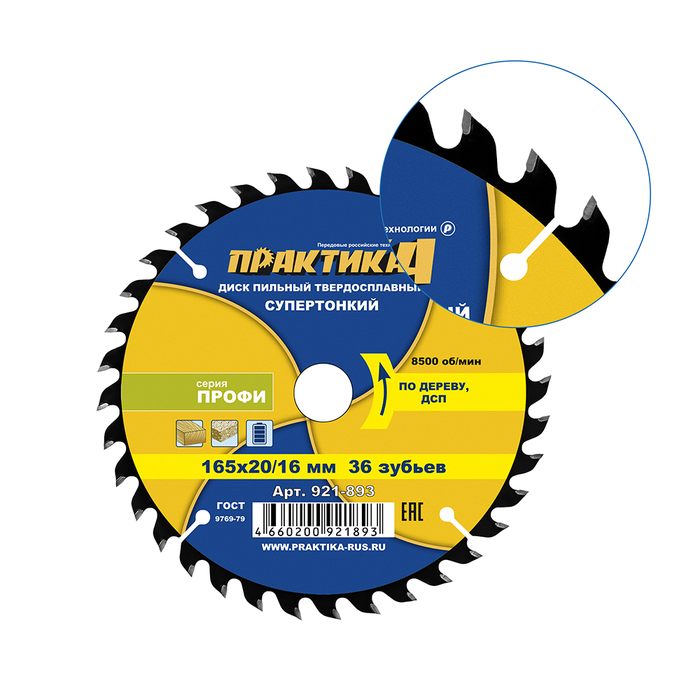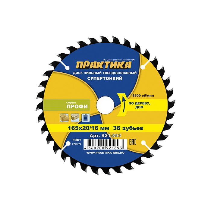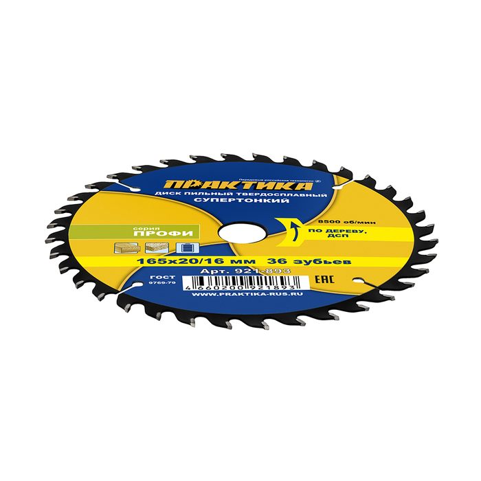 Диск пильный твердосплавный по дереву, ДСП ПРАКТИКА 165 х 20\16 мм, ТОНКИЙ, 36 зубьев (921-893) - цена, фото, технические характеристики