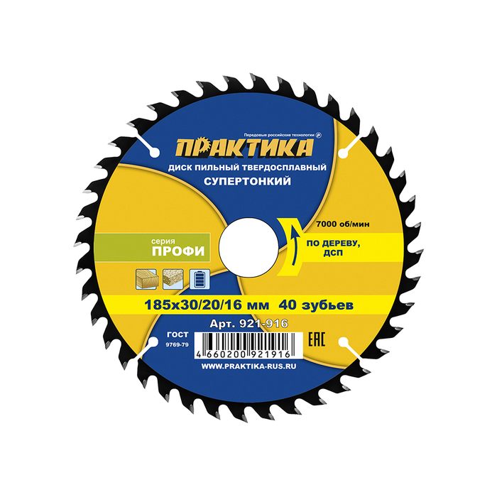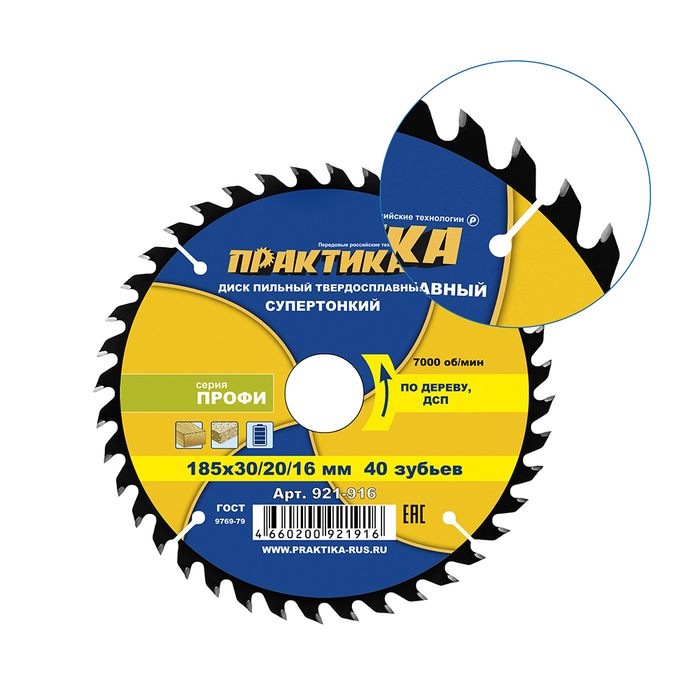 Диск пильный твердосплавный по дереву, ДСП ПРАКТИКА 185 х 30\20\16 мм, ТОНКИЙ, 40 зубьев (921-916) - цена, фото, технические характеристики