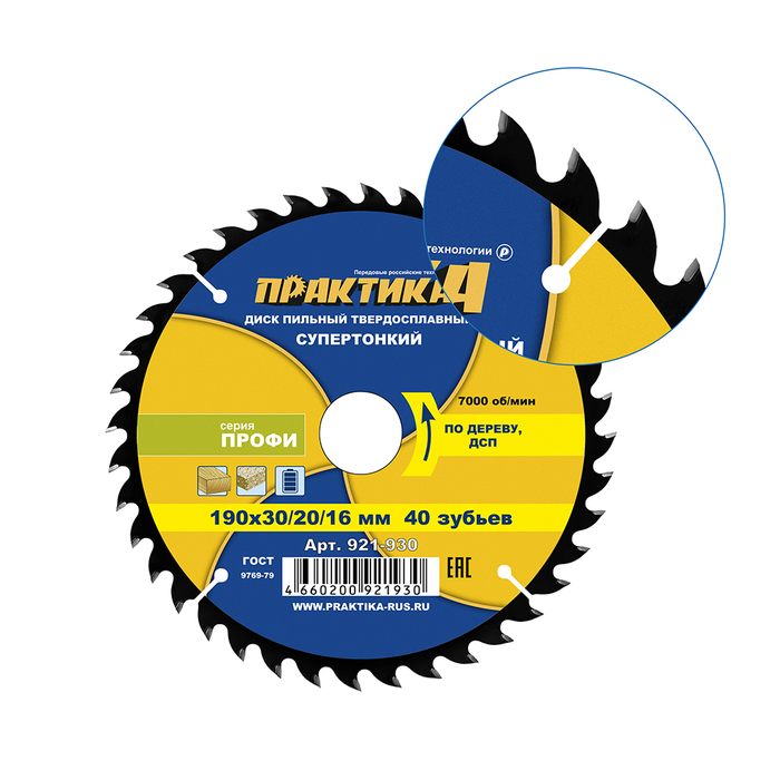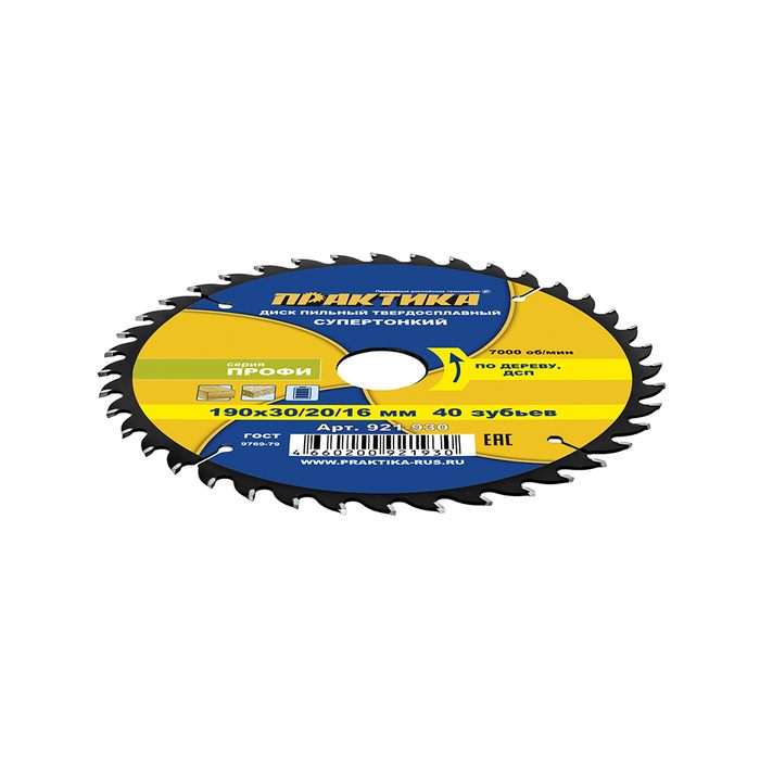 Диск пильный твердосплавный по дереву, ДСП ПРАКТИКА 190 х 30\20\16 мм, ТОНКИЙ, 40 зубьев (921-930) - цена, фото, технические характеристики