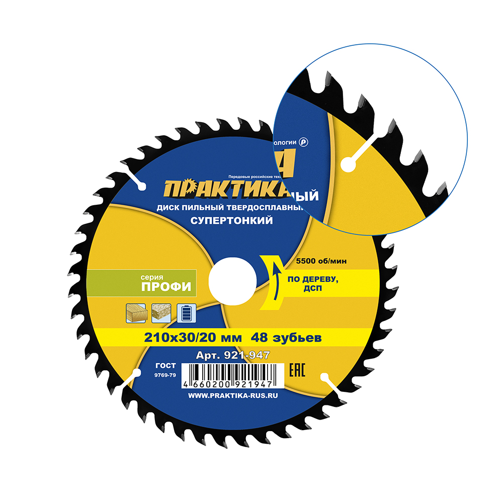 Диск пильный твердосплавный по дереву, ДСП ПРАКТИКА 210 х 30\20 мм, ТОНКИЙ, 48 зубьев (921-947) - цена, фото, технические характеристики