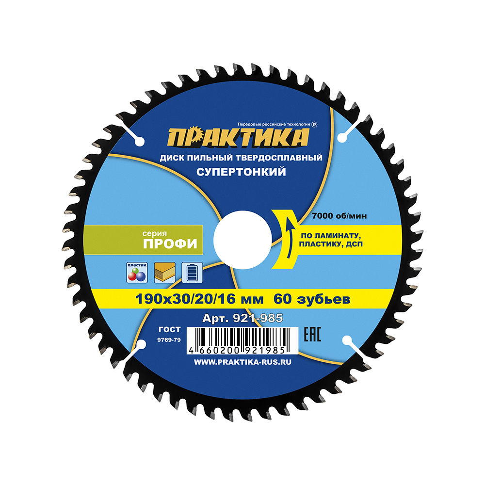 Диск пильный твердосплавный по ламинату ПРАКТИКА 190 х 30\20\16 мм, ТОНКИЙ, 60 зубьев (921-985) - цена, фото, технические характеристики