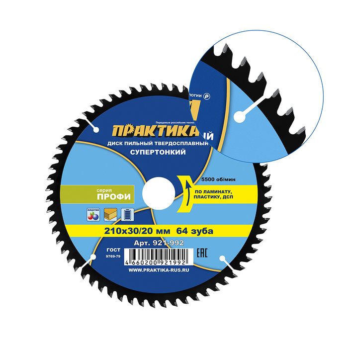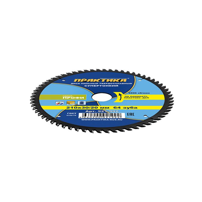 Диск пильный твердосплавный по ламинату ПРАКТИКА 210 х 30\20 мм, ТОНКИЙ, 64 зуба (921-992) - цена, фото, технические характеристики