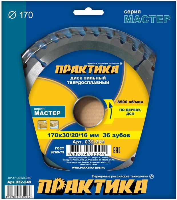 Диск пильный твердосплавный по дереву, ДСП ПРАКТИКА 170 х 30\20\16 мм, 36 зубьев (032-249) - цена, фото, технические характеристики