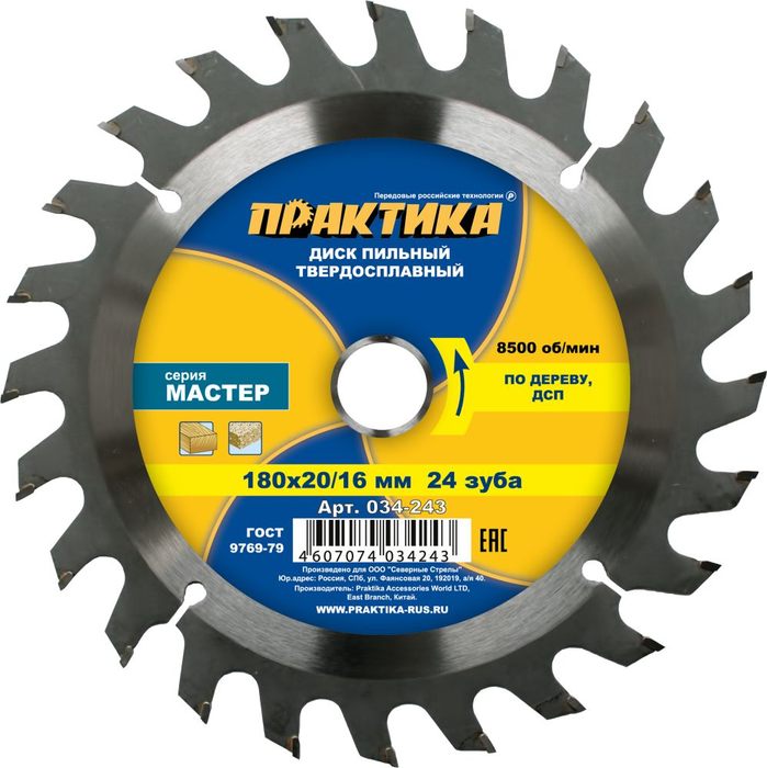 Диск пильный твердосплавный по дереву, ДСП ПРАКТИКА 180 х 20\16 мм, 24 зуба (034-243) - цена, фото, технические характеристики