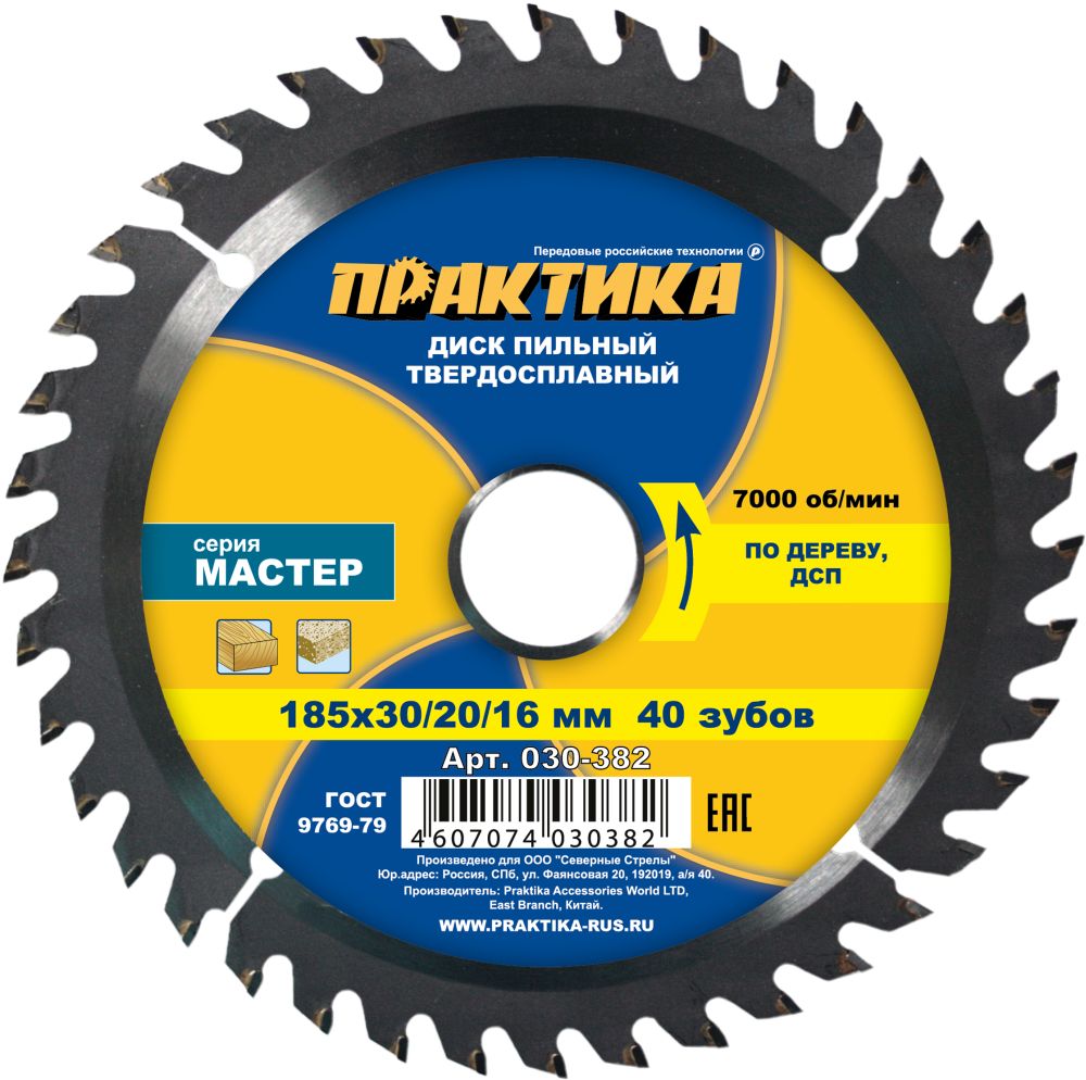 Диск пильный твердосплавный по дереву, ДСП ПРАКТИКА 185 х 30\20\16 мм, 40 зубьев (030-382) - цена, фото, технические характеристики