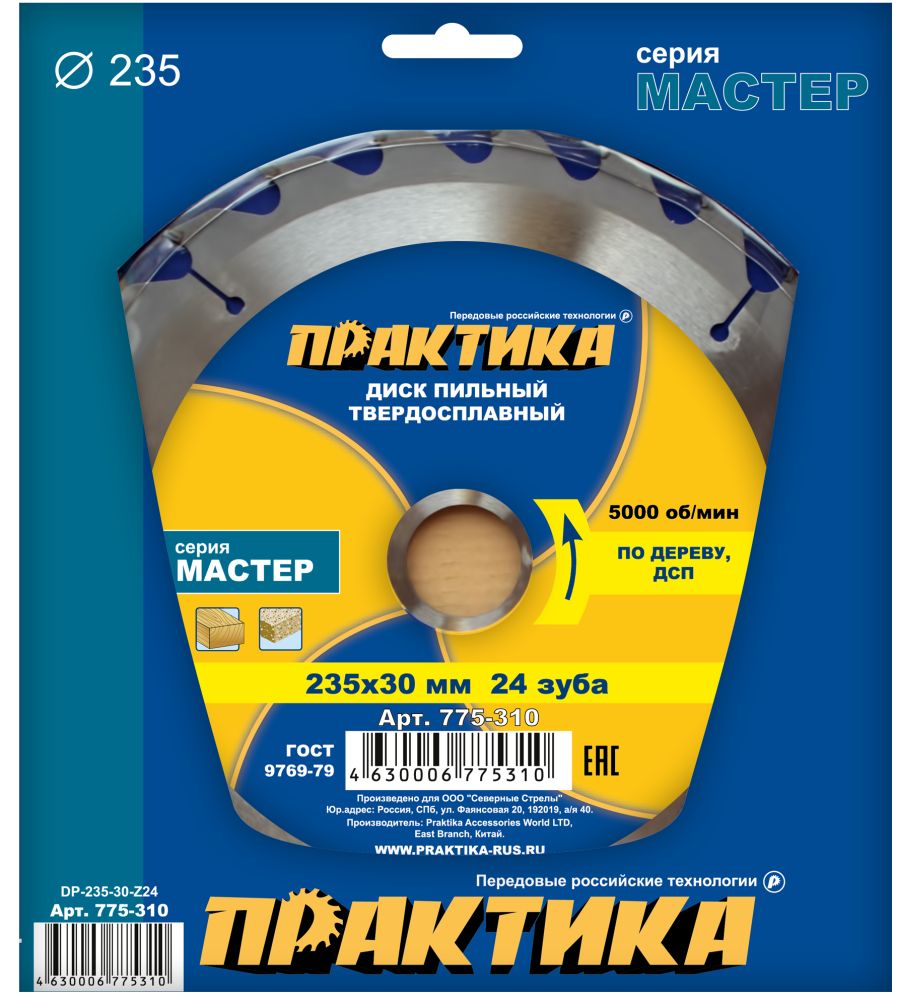 Диск пильный твердосплавный по дереву, ДСП ПРАКТИКА 235 х 30 мм, 24 зуба (775-310) (775-310)