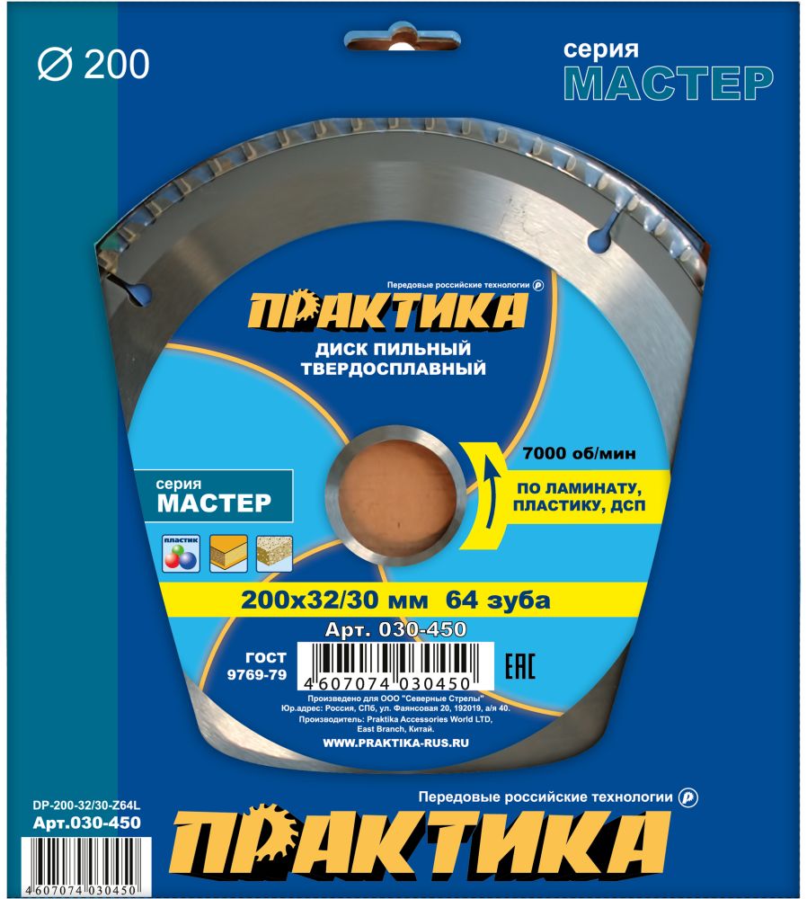 Диск пильный твердосплавный по ламинату ПРАКТИКА 200 х 32\30 мм, 64 зуба (030-450) (030-450)