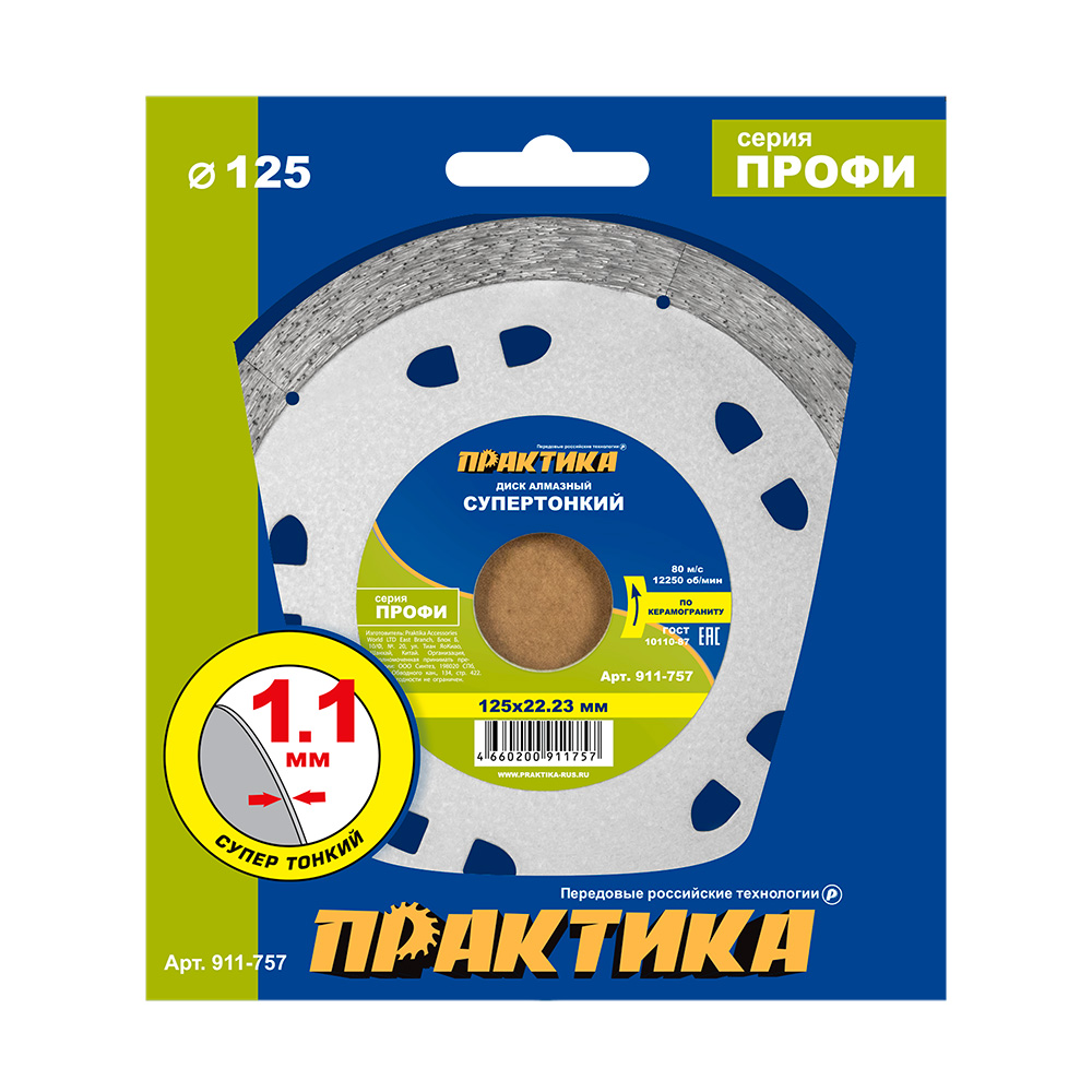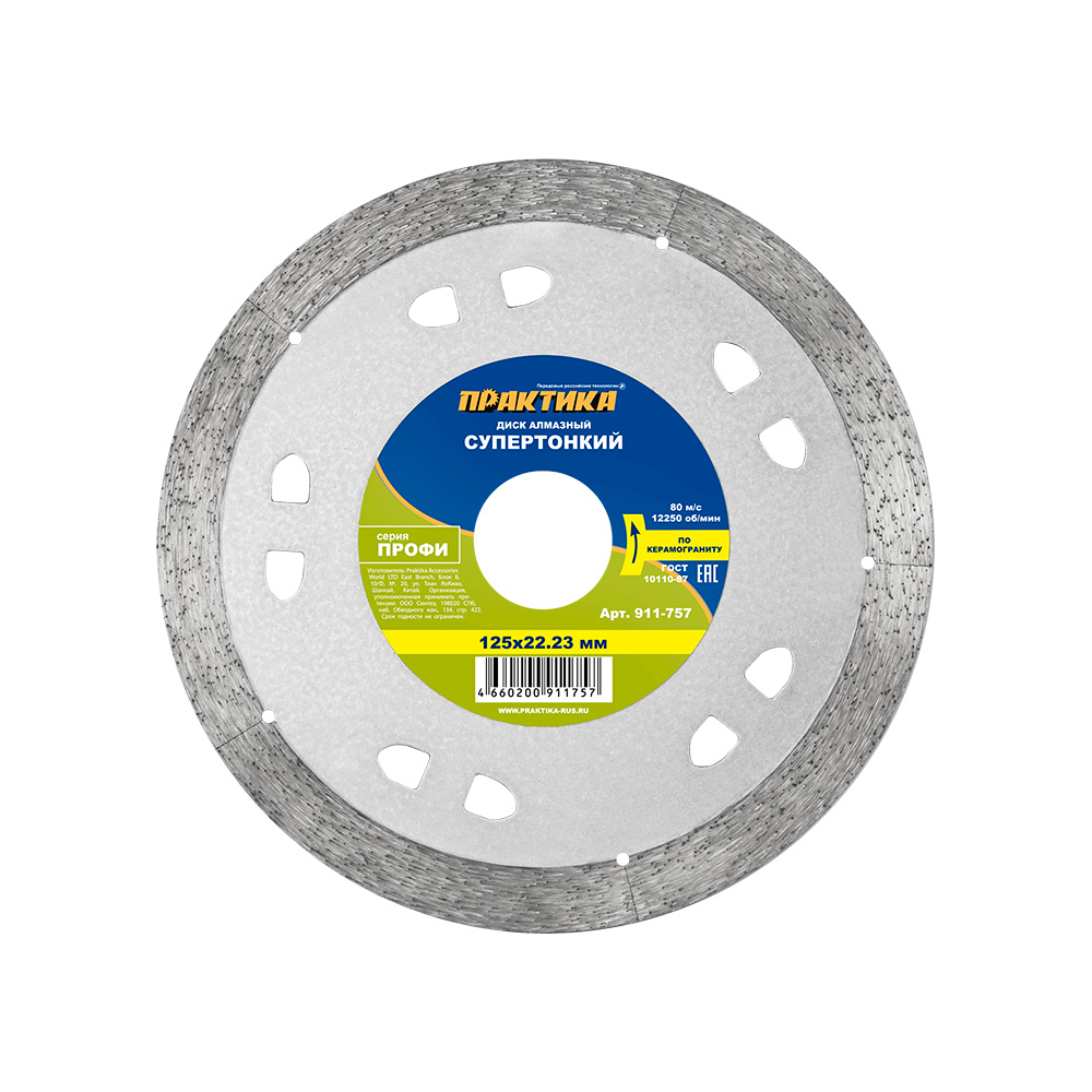 Диск алмазный несегментный ПРАКТИКА "Профи-Керамика" 125 х 22 х 10 мм, толщина 1,1мм (911-757) - цена, фото, технические характеристики