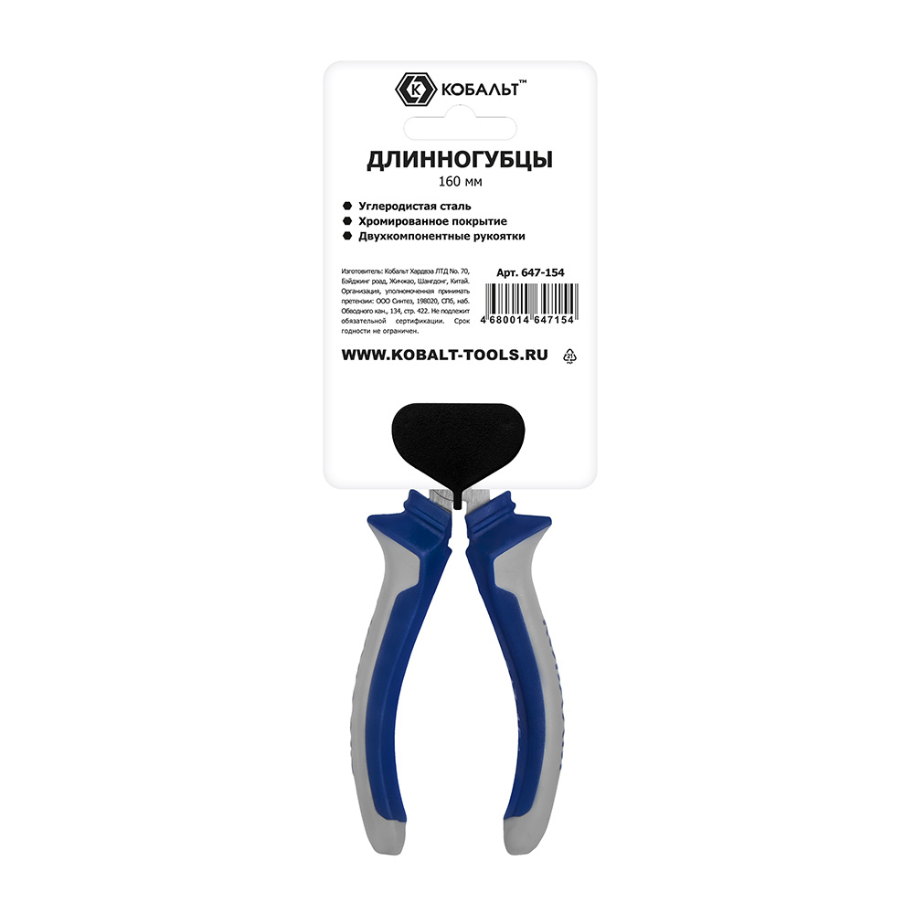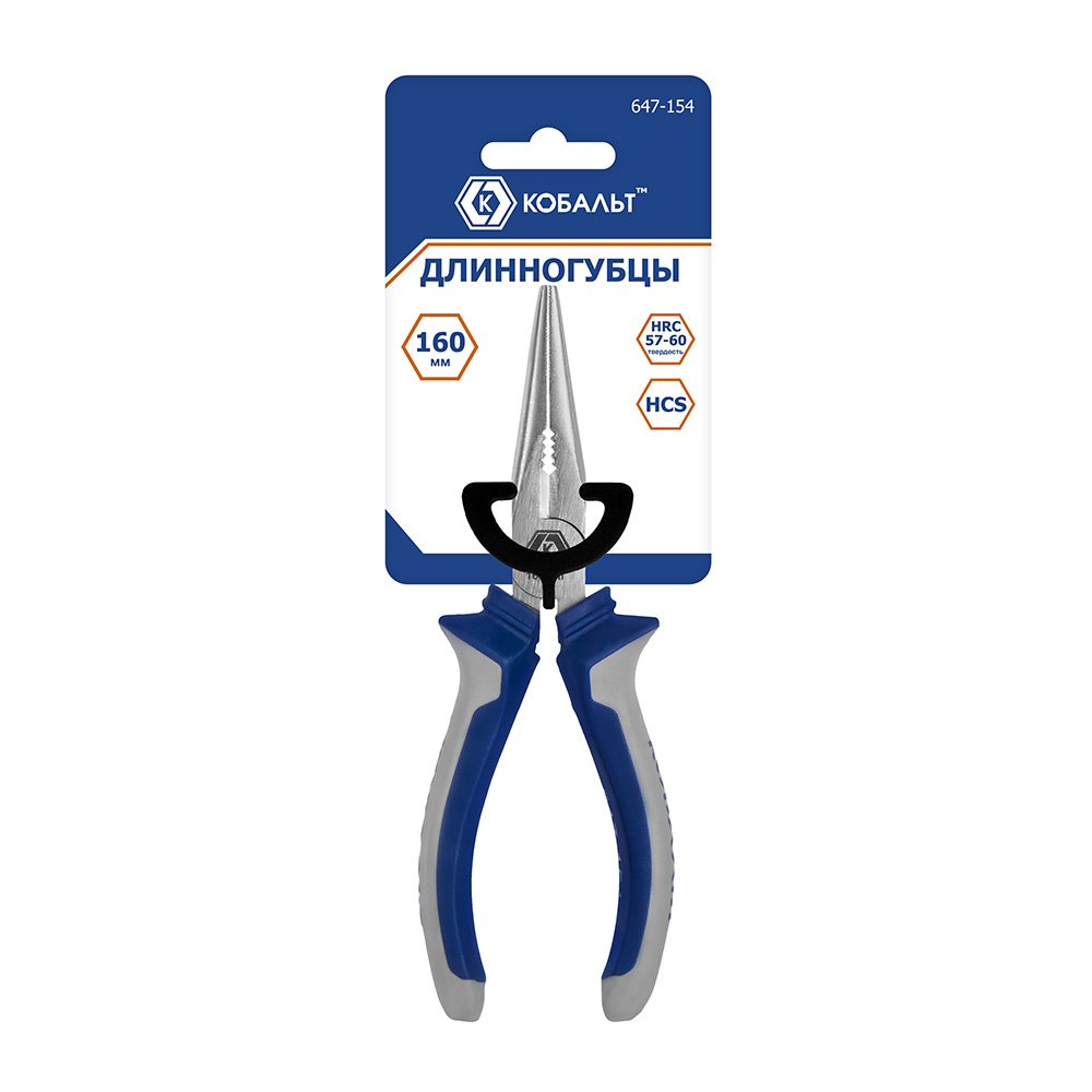 Длинногубцы КОБАЛЬТ 160 мм, с кусачками для проволоки, 2-х компонентные рукоятки, HCS, подвес (647-154) - цена, фото, технические характеристики