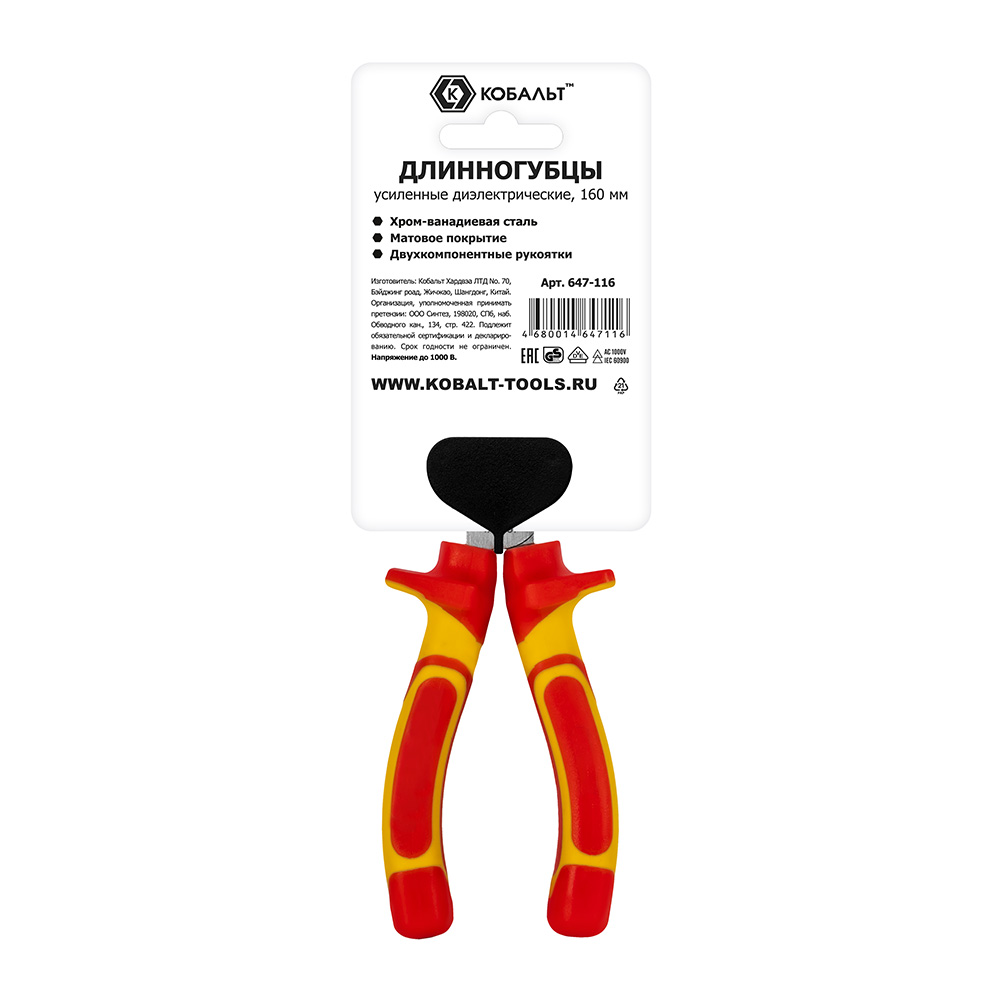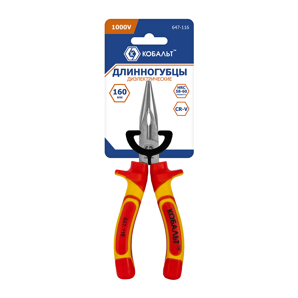 Длинногубцы КОБАЛЬТ диэлектрические, 160 мм, с кусачками для проволоки , CR-V, подвес (647-116) - цена, фото, технические характеристики