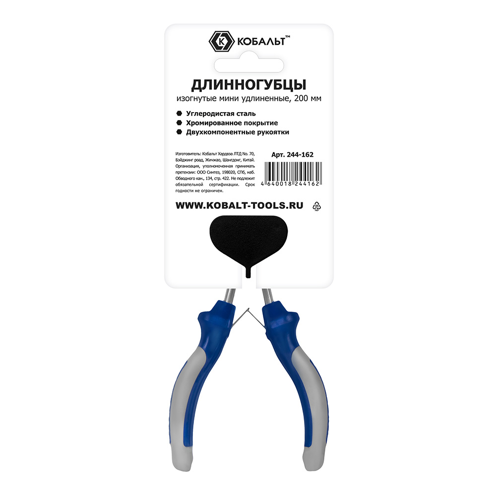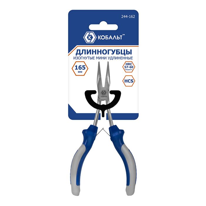 Длинногубцы КОБАЛЬТ изогнутые мини удлиненные, 165 мм, 2-х компонентные рукоятки, HCS, подвес (244-162) - цена, фото, технические характеристики