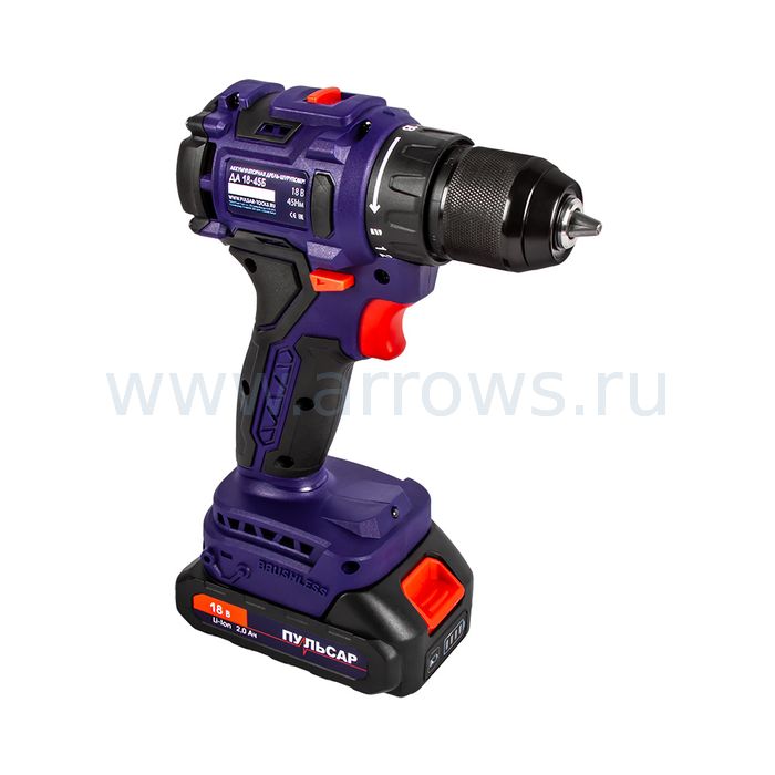 Дрель аккумуляторная безударная ПУЛЬСАР ДА 18-45Б (18В, 45Hm, Li-on, BL-мотор, 2,0 Ah, 2 акк., кейс) - цена, фото, технические характеристики