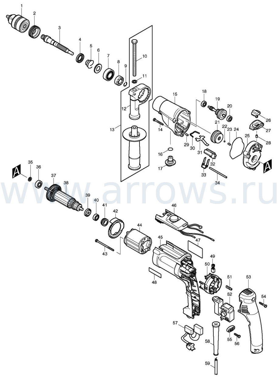 Дрель сетевая ударная MAKITA HP2070F (1010Вт, 0-1200/0-2900 об. мин, усиленный ключевой патрон, подсветка, кейс) - цена, фото, технические характеристики