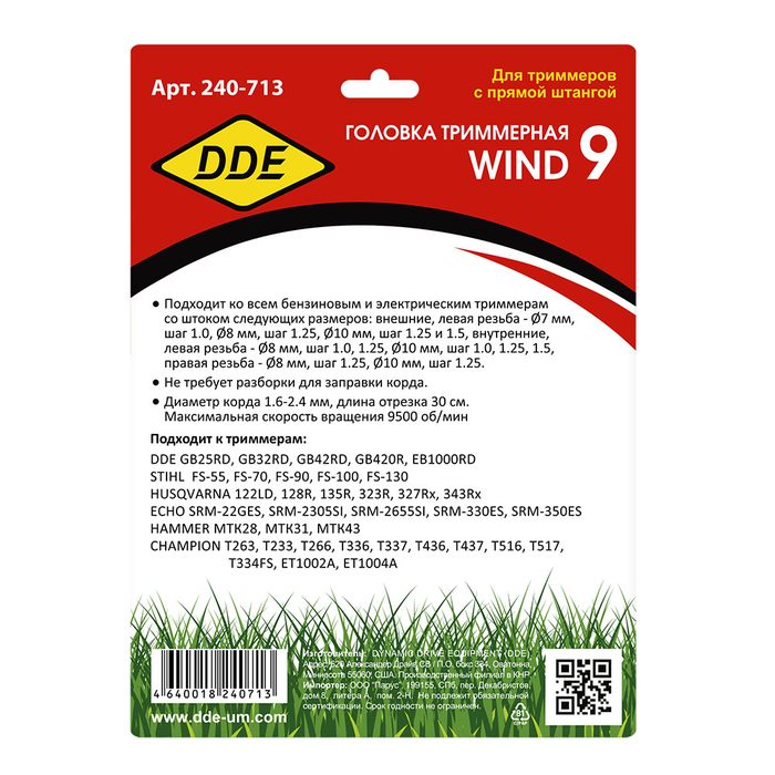 Головка триммерная DDE Wind 9 аналог "PIVOTRIM PRO", 8-ми прутк., (универсальная, 11 адапторов от М7 до М10) - цена, фото, технические характеристики