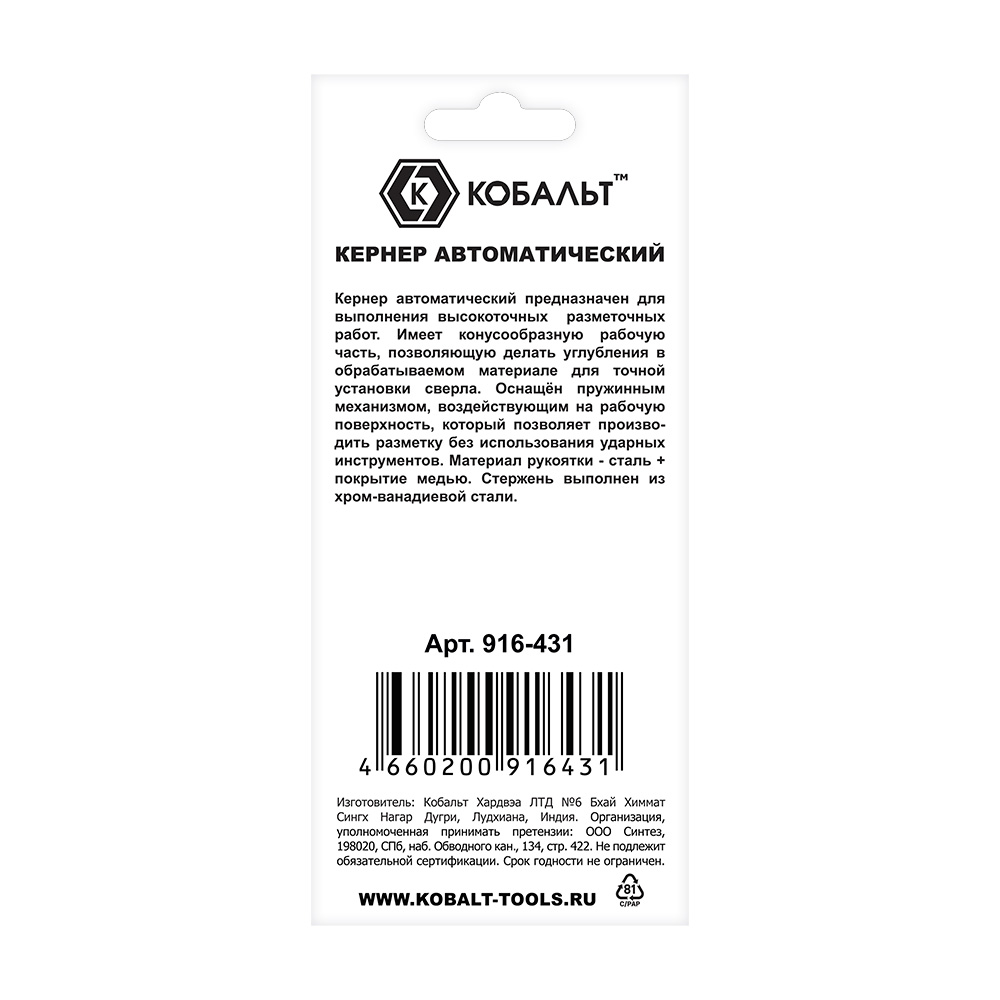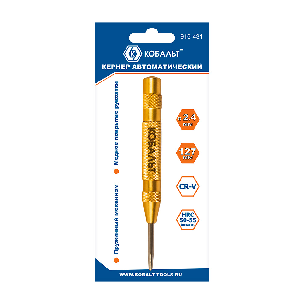 Кернер КОБАЛЬТ автоматический, 2.4 х 127 мм, материал рукоятки сталь+медь, стержень хром-ванадиевый, блистер (916-431) - цена, фото, технические характеристики
