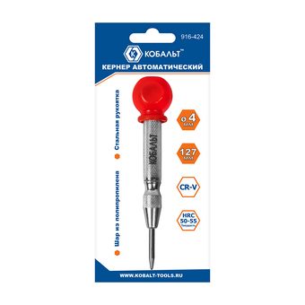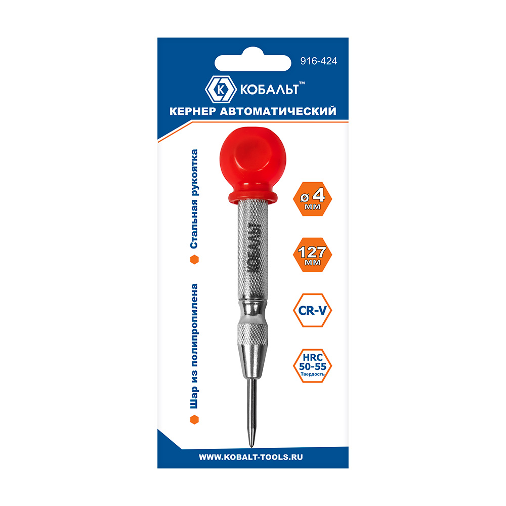 Кернер КОБАЛЬТ автоматический, 4 х 127 мм, материал рукоятки сталь, шар из полипропилена, стержень хром-ванадиевый, блистер (916-424) - цена, фото, технические характеристики