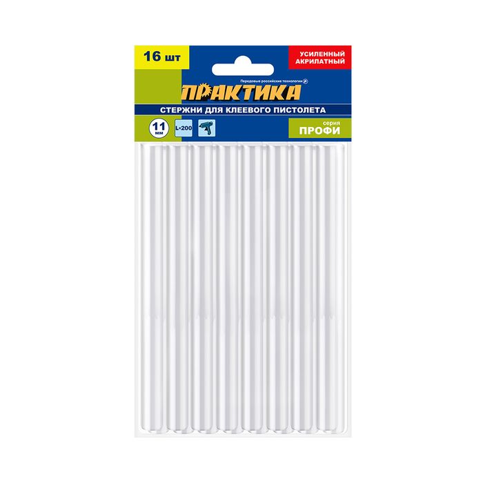 Клей для клеевого пистолета ПРАКТИКА белый, прозрачный, акрилатный, усиленный, 11 х 200 мм, 16 шт, пакет (916-479) - цена, фото, технические характеристики