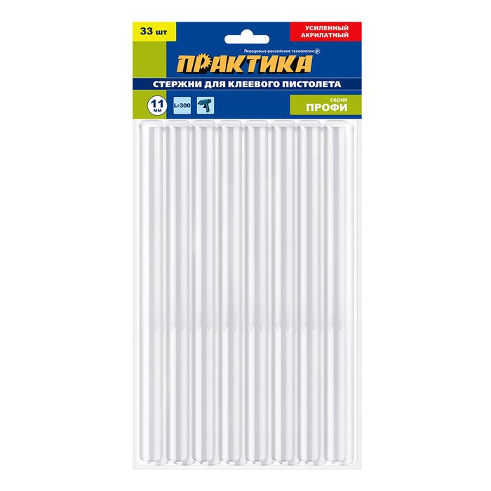 Клей для клеевого пистолета ПРАКТИКА белый, прозрачный, акрилатный, усиленный, 11 х 300 мм, 33 шт, пакет (916-486) - цена, фото, технические характеристики