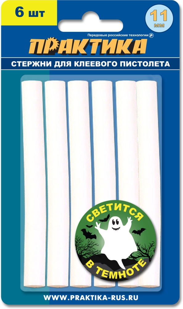 Клей для клеевого пистолета ПРАКТИКА белый, светящийся в темноте, 11 х 100 мм, 6шт / блист (790-243) 11 х 100 мм, 6шт / блистер