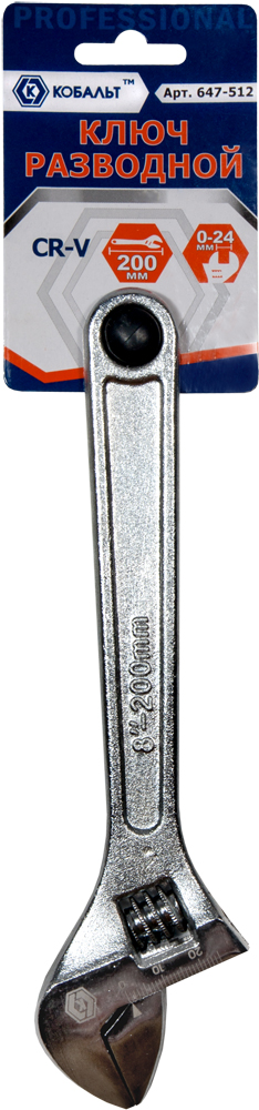 Ключ разводной КОБАЛЬТ 200 мм, ширина захвата 24 мм, CR-V, подвес (647-512) - цена, фото, технические характеристики