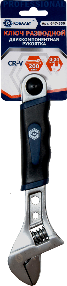 Ключ разводной КОБАЛЬТ 200 мм, ширина захвата 24 мм, двухкомпонентная рукоятка, CR-V, подвес (647-550) - цена, фото, технические характеристики