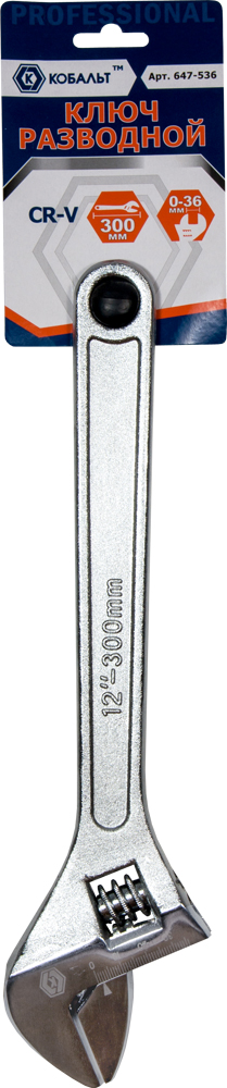 Ключ разводной КОБАЛЬТ 300 мм, ширина захвата 36 мм, CR-V, подвес (647-536) - цена, фото, технические характеристики