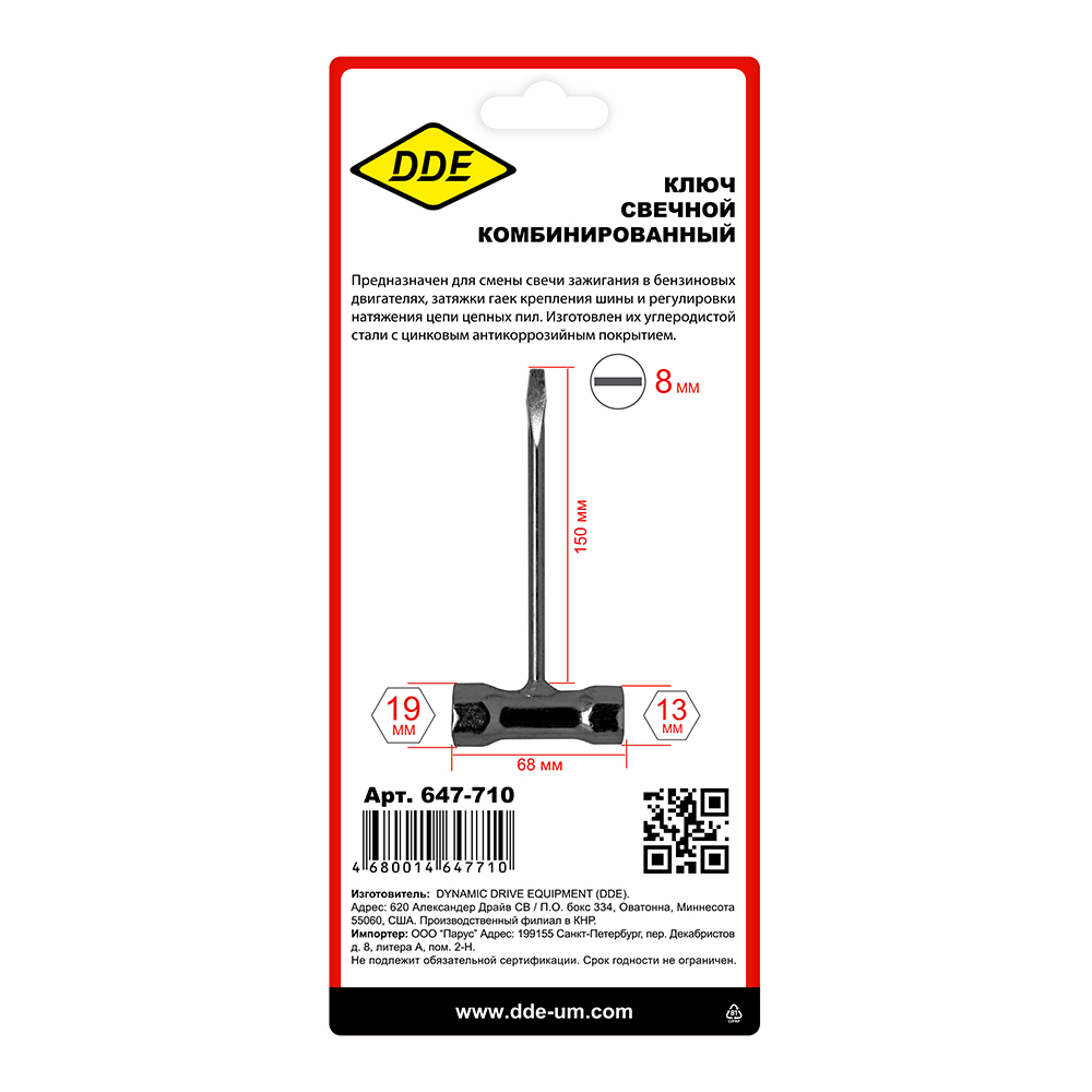 Ключ свечной комбинированный DDE 13*19мм (Husqvarna) - цена, фото, технические характеристики