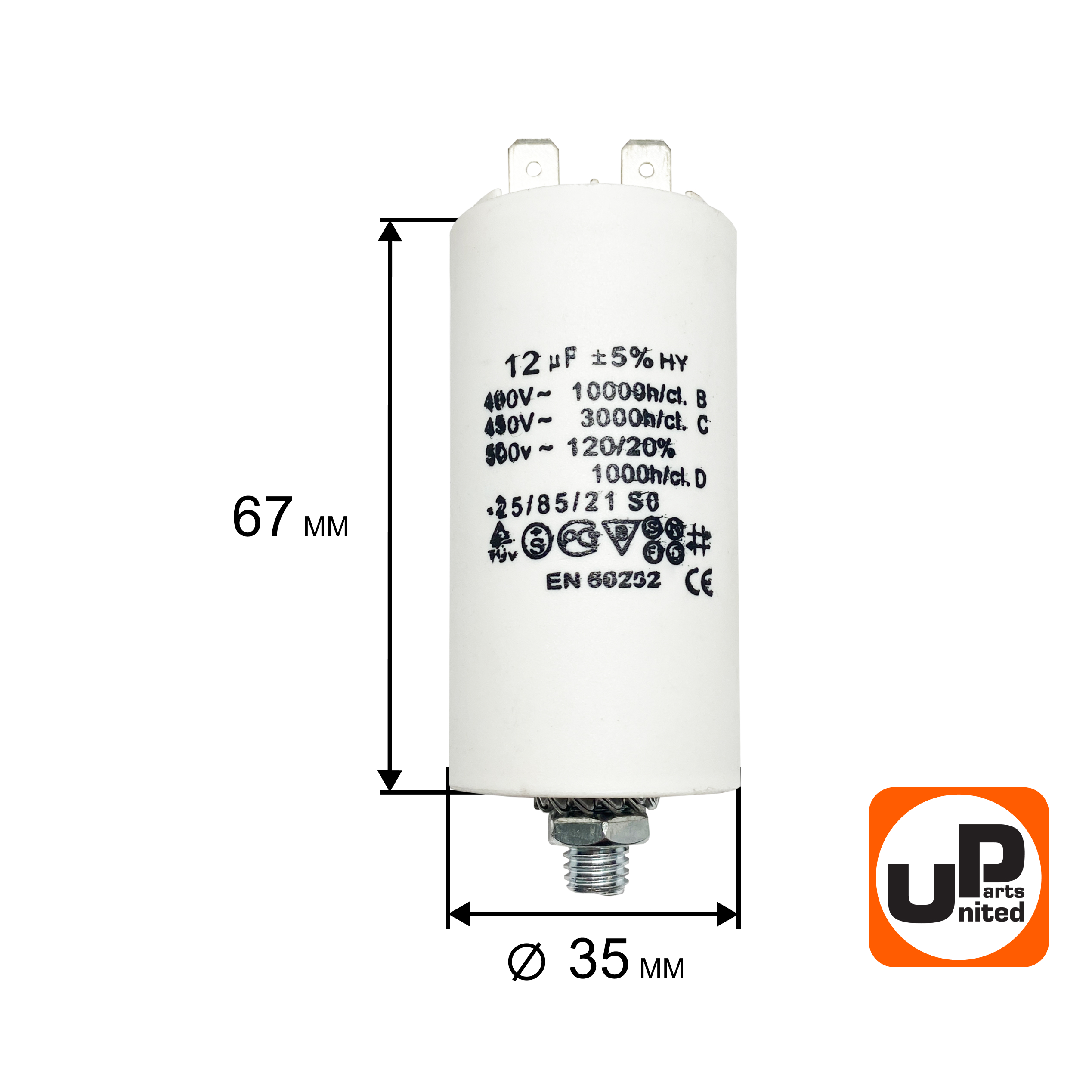 Конденсатор UNITED PARTS CBB60, 12 мкФ, 450В, 2 клеммы, шпилька M8 (90-0987) - цена, фото, технические характеристики
