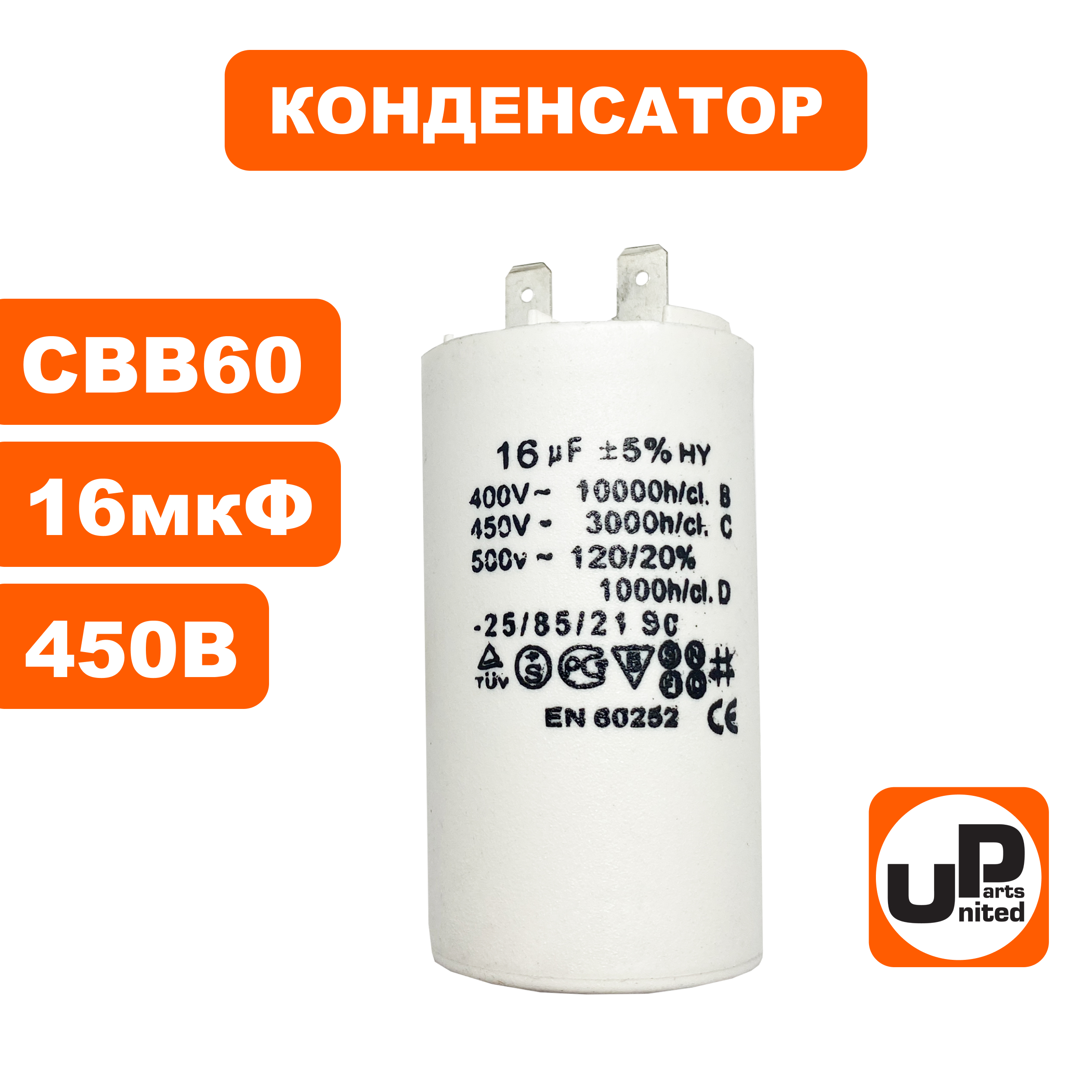 Конденсатор UNITED PARTS CBB60, 16 мкФ, 450В, 2 клеммы (90-0975) - цена, фото, технические характеристики