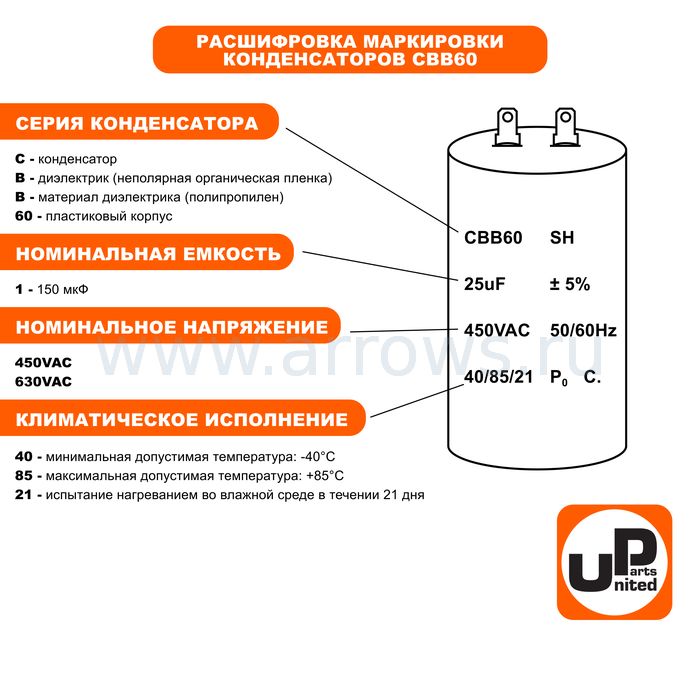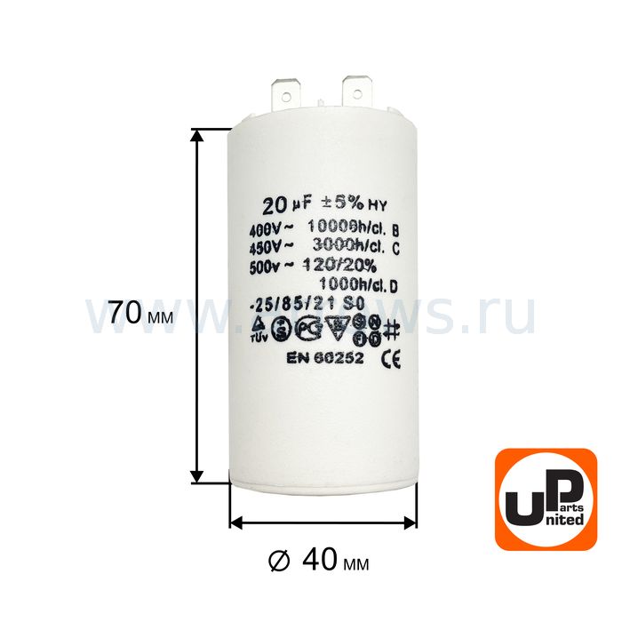 Конденсатор UNITED PARTS CBB60, 20 мкФ, 450В, 2 клеммы (90-0977) - цена, фото, технические характеристики