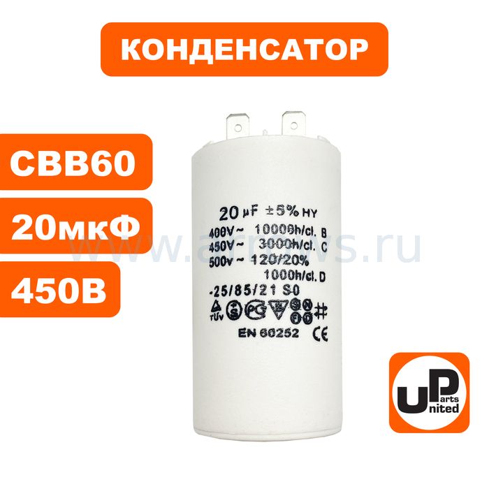 Конденсатор UNITED PARTS CBB60, 20 мкФ, 450В, 2 клеммы (90-0977)