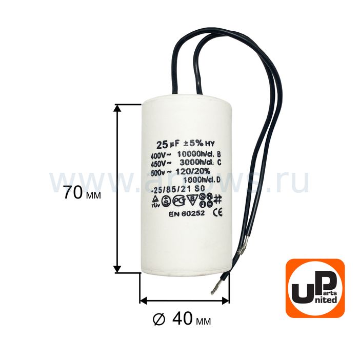 Конденсатор UNITED PARTS CBB60, 25 мкФ, 450В, гибкие выводы (90-0330) - цена, фото, технические характеристики