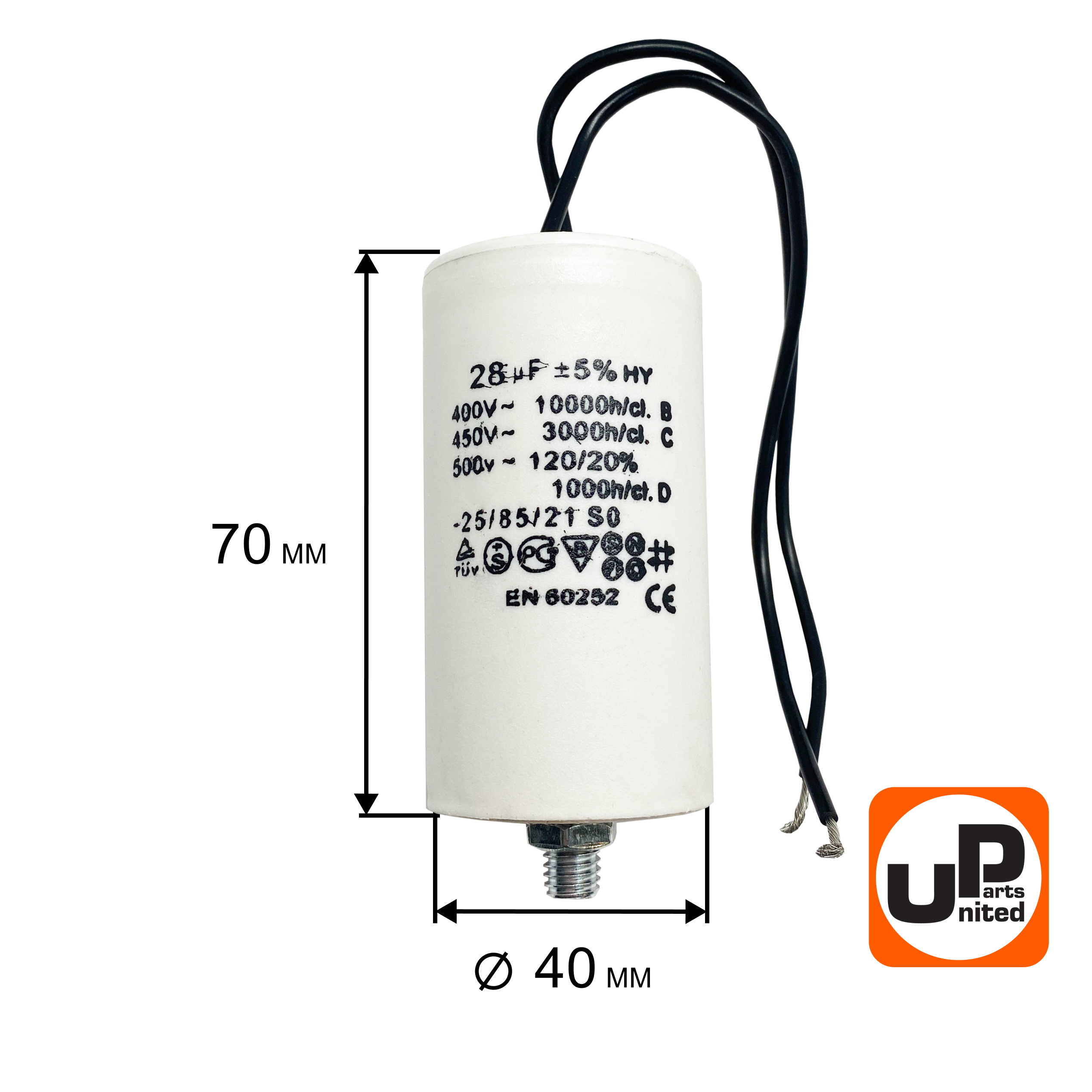 Конденсатор UNITED PARTS CBB60, 28 мкФ, 450В, гибкие выводы+шпилька (90-0334)